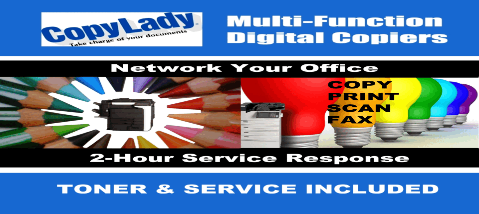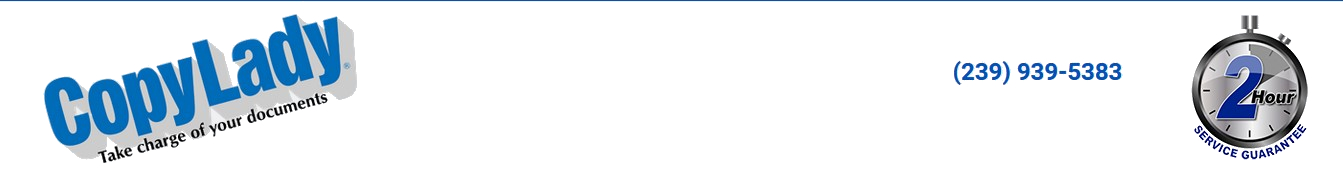 CopyLady: Proudly serving Sanibel, Captiva Island and SouthWest Florida since 2002!Listen......Do you want to know a secret?......Well, it's no secret that CopyLady has your ideal copier!At CopyLady, We carry Multifunction Printers from major brands such as Epson, Kyocera, and KIP.Not quite ready to break up with your current copier? We can help! We service all major brands!We fix em all! Laser, Inkjet, Thermal, Dot Matrix, we can fix it! Your 1966 Fender guitar amp? We'll certainly try!Need a toner, ink or other component for an existing machine? Can't find it anywhere else? We can help you!I heard it through the grapevine, that you couldn't wait on the line....We won't make you wait!We know, Waiting is a drag. That's why we have the CopyLady 2-Hour Response Guarantee!When you pick up that phone to call us for help, you can rest assured we will have a tech out to you within 2 hours of your call!Our team of highly trained copier technicians are always ready to help when the call comes in, You can also get quick assistance fromour help desk! Do you have a question about something on your copier or printer? Need some assistance with a feature? Give us a call!And our number is 239-939-5383, you can call us up for anything, any old time! (Admit it, you sang this last part!)The best things in life are free.....And CopyLady Provides these.....That's what you want! Your CopyLady service agreement comes with Toner and Ink to keep your machine humming along nicely. And you don't even need to call! With our Toner Replenishment System (TRS), We know when you need a toner, and will bring it right out to you!Once we see you are low on a toner, One of our technicians will bring a fresh one out to you! We carry a full selection of toners and inks in our Fort Myerswarehouse, so you never have to wait for it to be shipped out from some far away place! Copylady's plotters are LARGER THAN LIFE! Bring your creativity to life!Need to print out plans for a happening pad? Some groovy posters? Banners? Andy Warhol Artwork? Let CopyLady set you up with a high quality plotter!With sizes up to 44 inches, Let your creativity soar! Razor sharp Black & White, and Colors so real, you'd wouldn't think you were looking at a printout!It's time to put a CopyLady copier in your office! Call us at 239-939-5383!Don't settle for the least, Go for the best! Like what you see? Call now or visit our site to check out our specials!Call CopyLady Today at 239-939-5383Serving Sanibel, Captiva Island, and all of Southwest Florida.